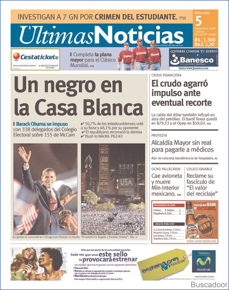 Los periódicos de todo el mundo reflejaron el triunfo de Barack Obama en sus portadas. Esta es una selección de veinte diarios de los cinco continentes que tuvieron en sus primeras planas a Obama presidente de EE.UU.